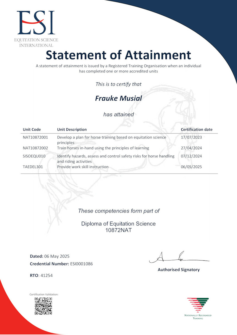 Als Teil meiner Reise zu meinen vierbeinigen Freunden habe ich mich bemüht, mein Wissen und meine Fertigkeiten stetig zu verbessern. Aus diesem Grund habe ich in den letzten Jahren eine Reihe zusätzlicher Qualifikationen erworben. Zurzeit bin ich Student des staatlich anerkannten australischen Ausbildungsgangs „Diploma of Equitation Science“.