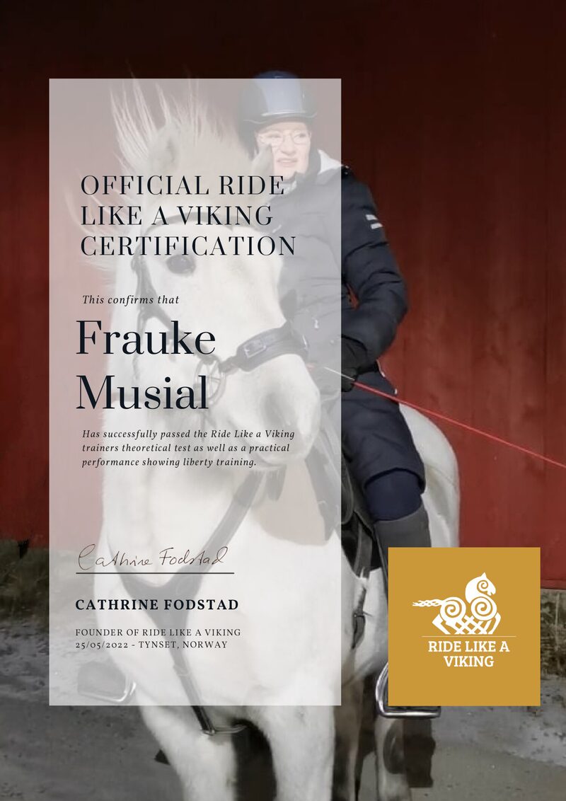 Cathrine Fodstad, die das Programm „Ride like a Viking“ entwickelt hat, ist Pferdetrainerin mit einem Diplom des renommierten Holar University College, Reykjavik, Island. Sie verfügt damit über einen der weltweit ganz wenigen Hochschulabschlüsse zu diesem Thema. Darüber hinaus ist sie zertifizierte Reitlehrerin des Norwegian Equine Center. “Ride like a Viking” ist weniger ein Programm als eine gewaltfreie Trainingsphilosophie, die auf wissenschaftlicher Evidenz (z.B. Lerntheorie), Kommunikation und Vertrauen zwischen Pferd und Mensch basiert. Ein Ansatz, den ich als ParaReiter sehr nützlich fand weshalb ich mich zum Trainer und Ausbilder dieser Methode weitergebildet habe.
